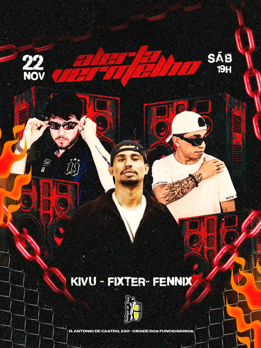 🔴 Sábado (22/11) — Alerta Vermelho com Kivu, Fixter e Fennix e se a pista pegar fogo, finge costume. Se o flerte esquentar, finge inocência.
